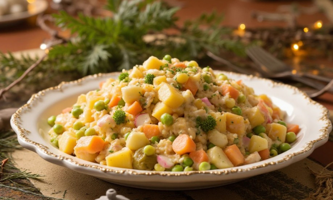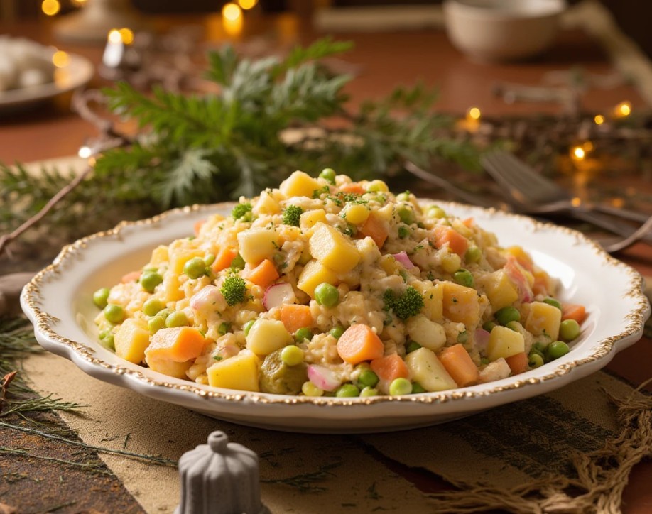 — Оливье. Ключевая проблема — высокое содержание холестерина. Одна порция салата содержит около 170 мг холестерина при суточной норме в 300 мг. Несколько порций за вечер значительно увеличивают нагрузку на сосуды и риск атеросклероза. Опасность также представляет майонез с трансжирами, которые накапливаются в печени и поджелудочной железе;