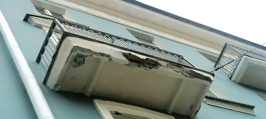 В редакции «Столицы на Онего» появились фотографии дома по адресу: проспект Ленина, 25/ Герцена, 43. На фото видно, как разрушены довольно большие фрагменты балконов здания.